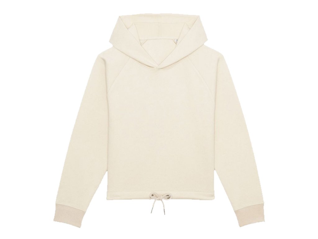 Dámska skrátená mikina s kapucňou vyrobená z 85% organickej a nebielenej bavlny značky Stanley/Stella v prirodzene krémovom odtieni Natural Raw a z 15% recyklovaného polyesteru. (Mikiny teda nie sú, žiaľ, kompostovateľné. Tričká áno.)
