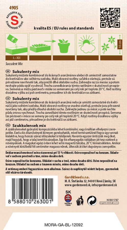 Sukulenty môžete kombinovať do krásnych aranžmánov alebo ich umiestniť samostatne do kvetináčov ako solitérnu ozdobu. Malé okrasné rastliny sa ľahko ošetrujú, pretože sú prirodzene navrhnuté tak, aby prežili dlhé obdobie sucha. Zalievajte raz za mesiac a potom nechajte pôdu opäť vyschnúť. Trochu zanedbávania týmto rastlinám v skutočnosti prospieva. Semená sa môžu pestovať v miske so semenami po celý rok pri teplote 20 °C. Keď rastliny dosiahnu výšku asi pol centimetra, presadíme ich do kvetináčov so zátkami.