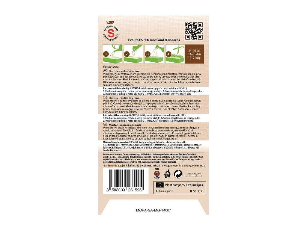PESTOVANIE MIKROZELENINY: POZOR! Substrát by nemal byť počas celej kultivácie príliš vlhký. 1. Plochú nádobu naplňte zeminou, potom ju zarovnajte a zalejte. 2. Semená nasypte husto po celom povrchu. 3. Dvakrát denne pokropte vodou a pestujte 2-3 týždne. Rastliny zrežte, keď vytvoria prvé listy.