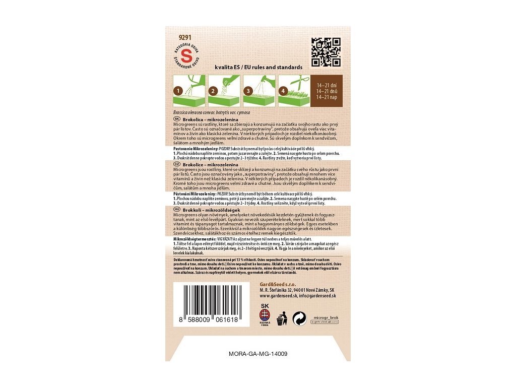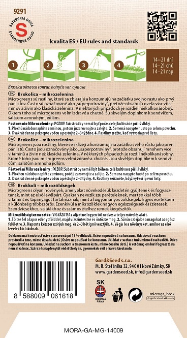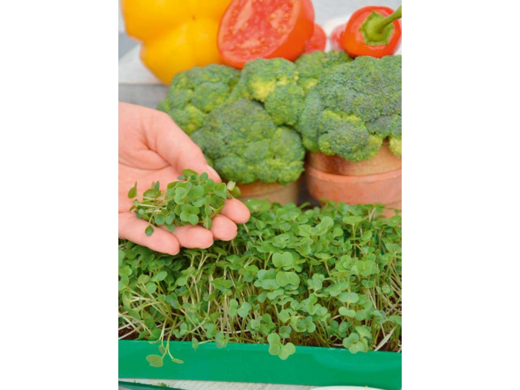 PESTOVANIE MIKROZELENINY: POZOR! Substrát by nemal byť počas celej kultivácie príliš vlhký. 1. Plochú nádobu naplňte zeminou, potom ju zarovnajte a zalejte. 2. Semená nasypte husto po celom povrchu. 3. Dvakrát denne pokropte vodou a pestujte 2-3 týždne. Rastliny zrežte, keď vytvoria prvé listy.