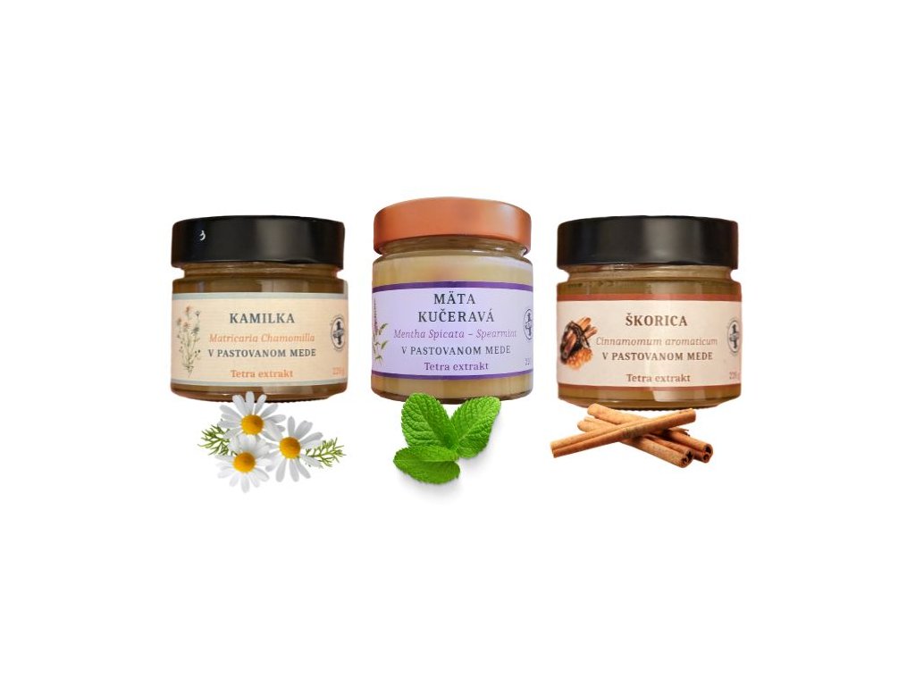 Prináša harmonické spojenie troch výnimočných terapeutických medov s tetra extraktom – rumanček, mäta kučeravá a škorica.